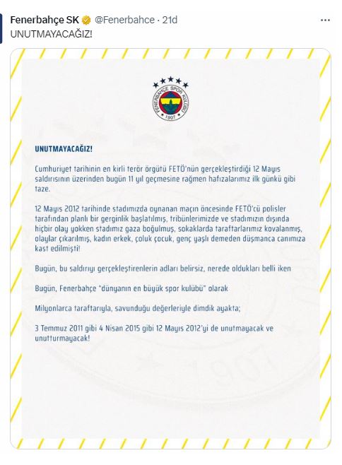 Fenerbahçe'den yapılan açıklamada, "UNUTMAYACAĞIZ!Cumhuriyet tarihinin en kirli terör örgütü FETÖ'nün gerçekleştirdiği 12 Mayıs saldırısının üzerinden bugün 11 yıl geçmesine rağmen hafızalarımız ilk günkü gibi taze. 12 Mayıs 2012 tarihinde stadımızda oynanan maçın öncesinde FETÖ'cü polisler tarafından planlı bir gerginlik başlatılmış, tribünlerimizde ve stadımızın dışında hiçbir olay yokken stadımız gaza boğulmuş, sokaklarda taraftarlarımız kovalanmış, olaylar çıkarılmış, kadın erkek, çoluk çocuk, genç yaşlı demeden düşmanca canımıza kast edilmişti! Bugün, bu saldırıyı gerçekleştirenlerin adları belirsiz, nerede oldukları belli iken Bugün, Fenerbahçe "dünyanın en büyük spor kulübü" olarak Milyonlarca taraftarıyla, savunduğu değerleriyle dimdik ayakta; 3 Temmuz 2011 gibi 4 Nisan 2015 gibi 12 Mayıs 2012'yi de unutmayacak ve unutturmayacak!" ifadeleri yer aldı.