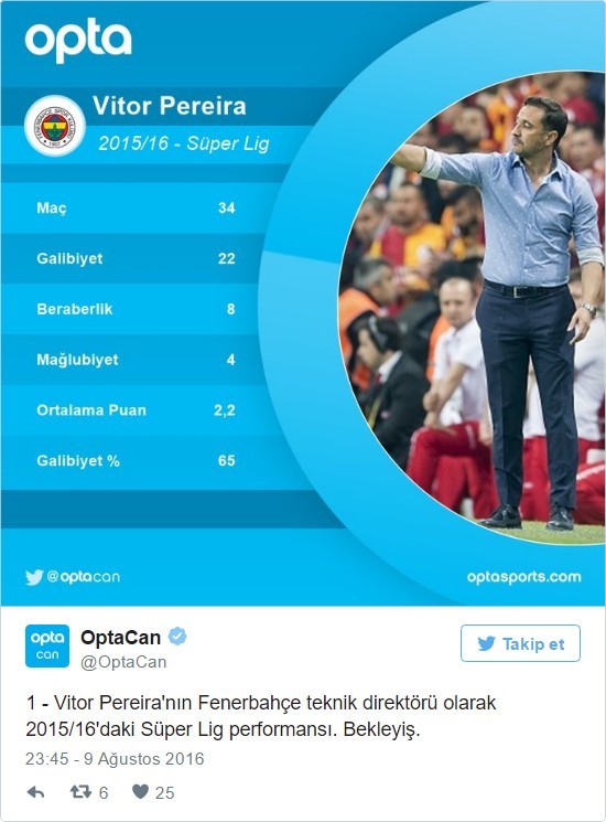 Vitor Pereira, Fenerbahçe'nin başında geçtiğimiz sezon 34 lig maçında 22 galibiyet, 8 beraberlik ve 4 mağlubiyet almıştı. Beşiktaş'a şampiyonluğu kaptırdıktan sonra takımdan gönderilmesi beklenen Pereira tazminatı sebebiyle görevine devam etmiş ancak Monaco karşısında alınan 3-1'lik mağlubiyet bardağı taşıran son damla olmuştu.
