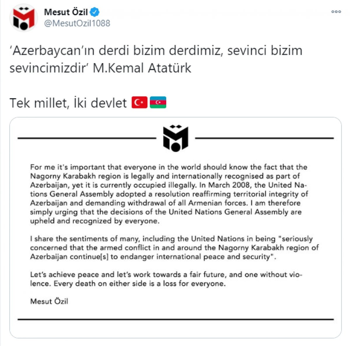 Öte yandan, Mesut Özil'in yaşadığı ırkçı saldırılar bununla da sınırlı kalmadı. Çin'in Uygur Türklerine yaptığı zulme karşı da sesini yükselten 32 yaşındaki futbolcu, Hz. Ali'nin "Zulme engel olamıyorsanız, Onu herkese duyurun." sözleriyle tüm dünyayı sessiz kalmamaya davet etmişti.