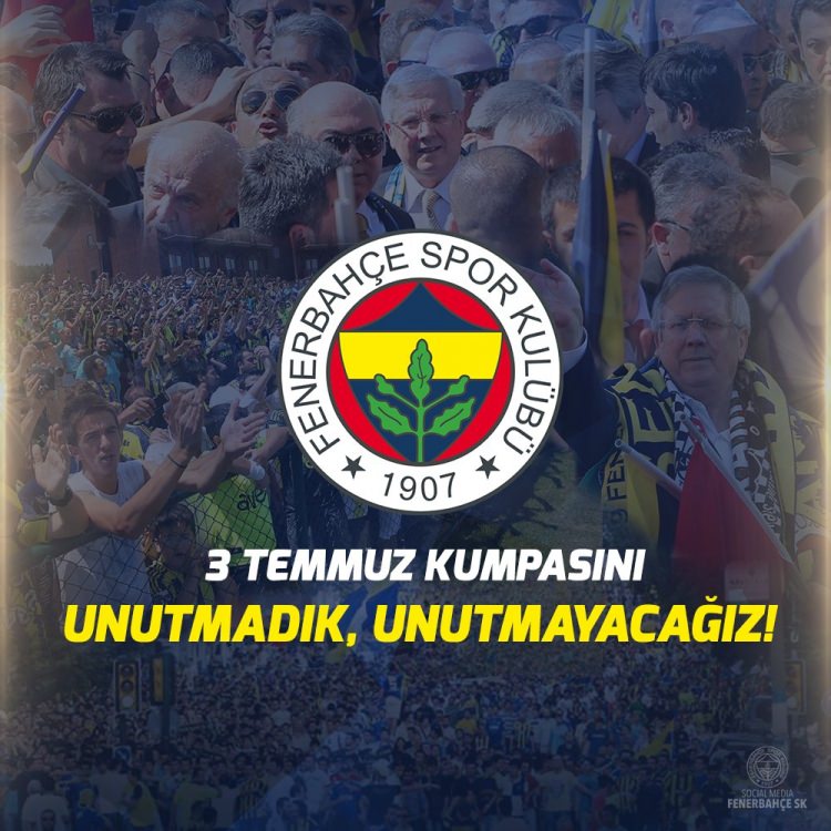 Fenerbahçe Spor Kulübü'nün sosyal medya hesabından yayınlanan mesajda, "3 Temmuz kumpasını unutmadık, unutmayacağız" ifadeleri kullanıldı.