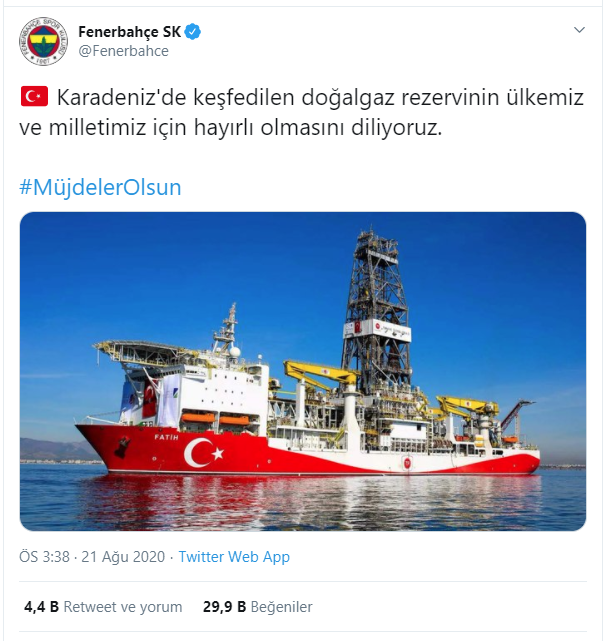 Twitter’dan açıklama yapan Fenerbahçe, “Karadeniz'de keşfedilen doğalgaz rezervinin ülkemiz ve milletimiz için hayırlı olmasını diliyoruz.” paylaşımını yaptı.