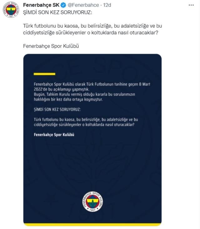 Fenerbahçe'den yapılan açıklamada, "Şimdi son kez soruyoruz: Türk futbolunu bu kaosa, bu belirsizliğe, bu adaletsizliğe ve bu ciddiyetsizliğe sürükleyenler o koltuklarda nasıl oturacaklar?" ifadeleri kullanıldı.