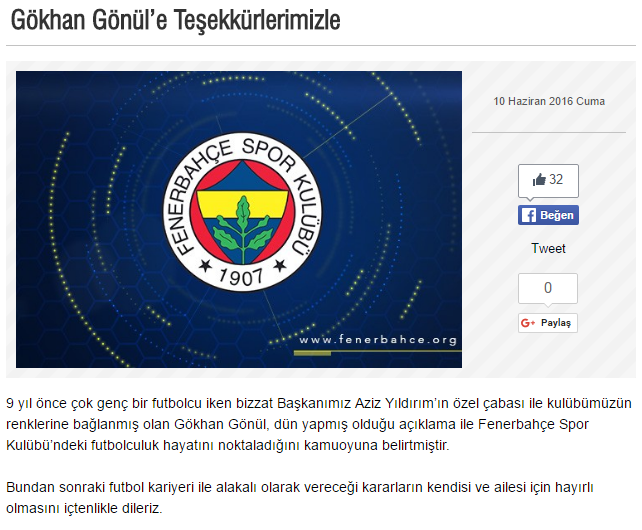 - 9 yıl önce çok genç bir futbolcu iken bizzat Başkanımız Aziz Yıldırım'ın özel çabası ile kulübümüzün renklerine bağlanmış olan Gökhan Gönül, dün yapmış olduğu açıklama ile Fenerbahçe Spor Kulübü'ndeki futbolculuk hayatını noktaladığını kamuoyuna belirtmiştir.