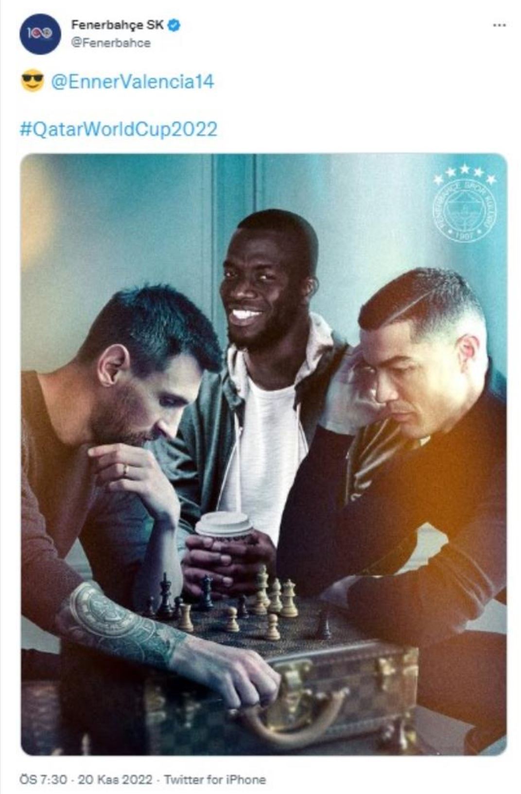 Gelmiş geçmiş en iyi futbolcular olarak gösterilen Messi ve Ronaldo'nun turnuva öncesi çektirdiği fotoğraf, Fenerbahçe tarafından ti'ye alındı. Sarı-Lacivertliler, Messi ve Ronaldo'nun satranç oynadığı fotoğrafın arkasına Valencia'nın kahve içtiği fotoğrafı ekledi. Bu paylaşım 1 saat içinde 100 bine yakın beğeni aldı.