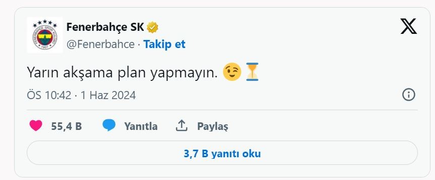 Fenerbahçe yaptığı paylaşımda "Yarın akşama plan yapmayın" ifadelerini kullandı.