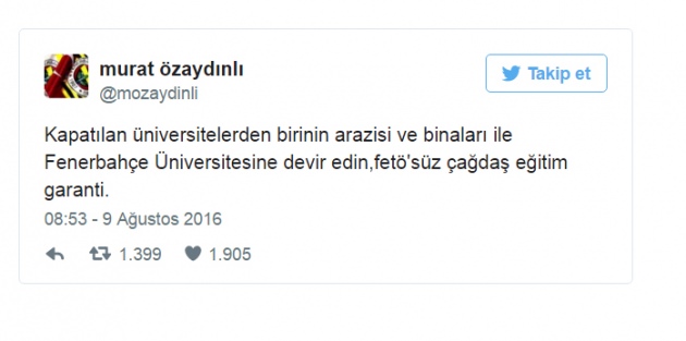 "Kapatılan üniversitelerden birini arazisi ve binaları ile Fenerbahçe Üniversitesi'ne devredin. FETÖ'süz çağdaş eğitim garanti."