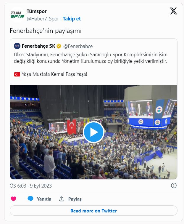 Fenerbahçe Kulübü Tüzük Tadil Kongresi'nde, Ülker Stadyumu Şükrü Saracoğlu Spor Kompleksi isminin, 'Atatürk' olarak değiştirilmesine karar verdi.