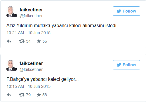 Twitter hesabından Fenerbahçe'nin yabancı bir kaleci alacağını iddia eden Faik Çetiner, "Aziz Yıldırım mutlaka yabancı kaleci alınmasını istedi" dedi. Volkan Demirel ya da Mert Günok'tan birinin takımdan gönderilebileceğini açıklyan Çetiner, "Fenerbahçe'ye yabancı kaleci geliyor. Volkan ve Mert konusunda kararı yeni teknik direktör verecek. Biri gidebilir" tweetini attı.