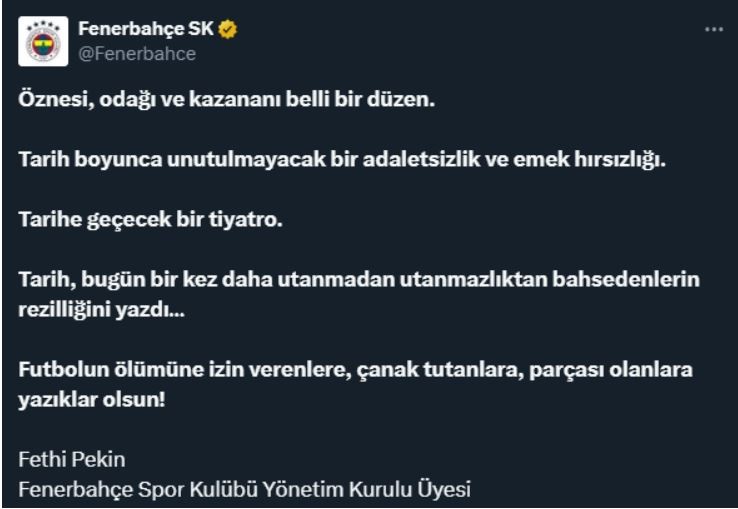 Fethi Pekin'in açıklamasının tamamında, "Öznesi, odağı ve kazananı belli bir düzen. Tarih boyunca unutulmayacak bir adaletsizlik ve emek hırsızlığı. Tarihe geçecek bir tiyatro. Tarih, bugün bir kez daha utanmadan utanmazlıktan bahsedenlerin rezilliğini yazdı… Futbolun ölümüne izin verenlere, çanak tutanlara, parçası olanlara yazıklar olsun!" ifadeleri yer aldı.