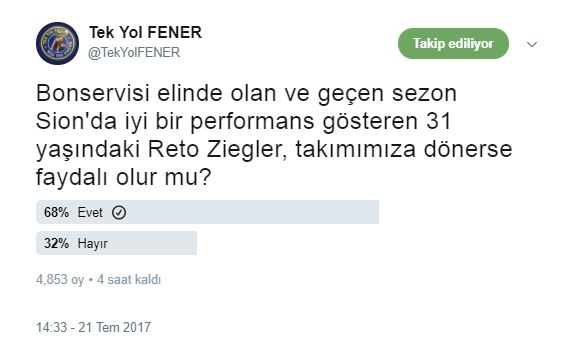 Yeni sezon öncesi takımdaki eksik noktalarını gidermek için çalışmalarını yürüten Fenerbahçe'de eski oyunculardan Ziegler gündeme geldi. Sözleşmesi elinde bulunan futbolcu için taraftarlar da yaptıkları anketle yönetime mesaj gönderdi.
