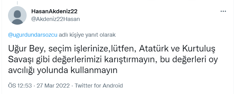 “Uğur Bey, seçim işlerinize,lütfen, Atatürk ve Kurtuluş Savaşı gibi değerlerimizi karıştırmayın, bu değerleri oy avcılığı yolunda kullanmayın”