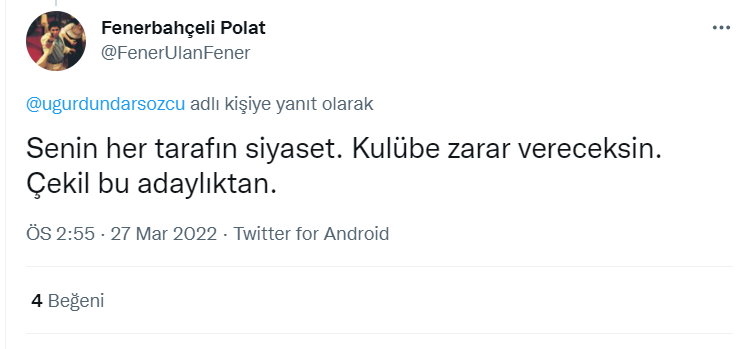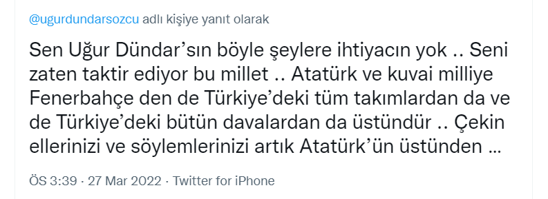 “Sen Uğur Dündar’sın böyle şeylere ihtiyacın yok .. Seni zaten taktir ediyor bu millet .. Atatürk ve kuvai milliye Fenerbahçe den de Türkiye’deki tüm takımlardan da ve de Türkiye’deki bütün davalardan da üstündür .. Çekin ellerinizi ve söylemlerinizi artık Atatürk’ün üstünden …”