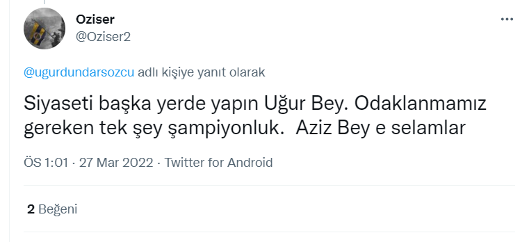 “Siyaseti başka yerde yapın Uğur Bey. Odaklanmamız gereken tek şey şampiyonluk. Aziz Bey e selamlar”
