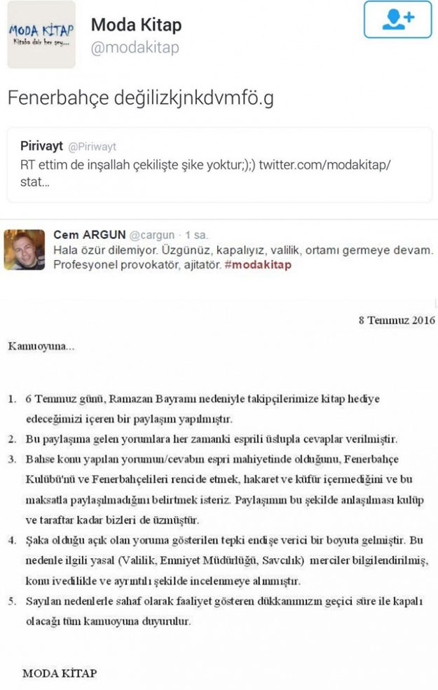 Moda Kitap, Twitter'dan bir duyuru yaparak, Ramazan Bayramı nedeniyle takipçilerineücretsiz kitap dağıtacağını bildirdi. Bu tweeti gören takipçilerden birinin, "RT ettim ama inşallah şike yoktur" şeklindeki tweetine Moda Kitap'tan ortalığı karıştıran şu cevap geldi: