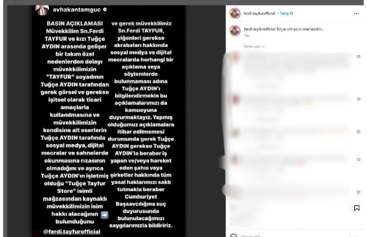 Uzun süredir gözlerden uzak bir yaşam süren ve kızı Tuğçe Tayfur’un düğününe dahi katılmayan Ferdi Tayfur, son paylaşımıyla gündem oldu. Avukatı aracılığıyla açıklama yapan Ferdi Tayfur, Müvekkilim Sayın Ferdi Tayfur ve kızı Tuğçe Aydın arasında gelişen birtakım özel nedenlerden dolayı müvekkilimizin 'Tayfur' soyadının Tuğçe Aydın tarafından gerek görsel gerekse işitsel olarak ticari amaçlarla kullanılmasına ve müvekkilimizin kendisine ait eserlerin Tuğçe Aydın tarafından sosyal medya, dijital mecralar ve sahnelerde okunmasına rızasının olmadığını ve ayrıca Tuğçe Aydın'ın işletmiş olduğu 'Tuğçe Tayfur Store' isimli mağazasından kaynaklı müvekkilimizin isim hakkı alacağının bulunduğunu ve gerek müvekkilimiz Sayın Ferdi Tayfur, yeğenleri gerekse akrabaları hakkında sosyal medya ve dijital mecralarda herhangi bir açıklama veya söylemlerde bulunmaması adına Tuğçe Aydın'ı bilgilendirmekle bu açıklamalarımızı da kamuoyuna duyurmaktayız. Yapmış olduğumuz açıklamalara itibar edilmemesi durumunda gerek Tuğçe Aydın gerekse Tuğçe Aydın ile beraber iş yapan ve hareket eden şahıs veya şirketler hakkında tüm yasal haklarımızı saklı tutmakla beraber Cumhuriyet Başsavcılığı'na suç duyurusunda bulunacağımızı bildiririz." ifadelerini kamuoyu ile paylaştı.