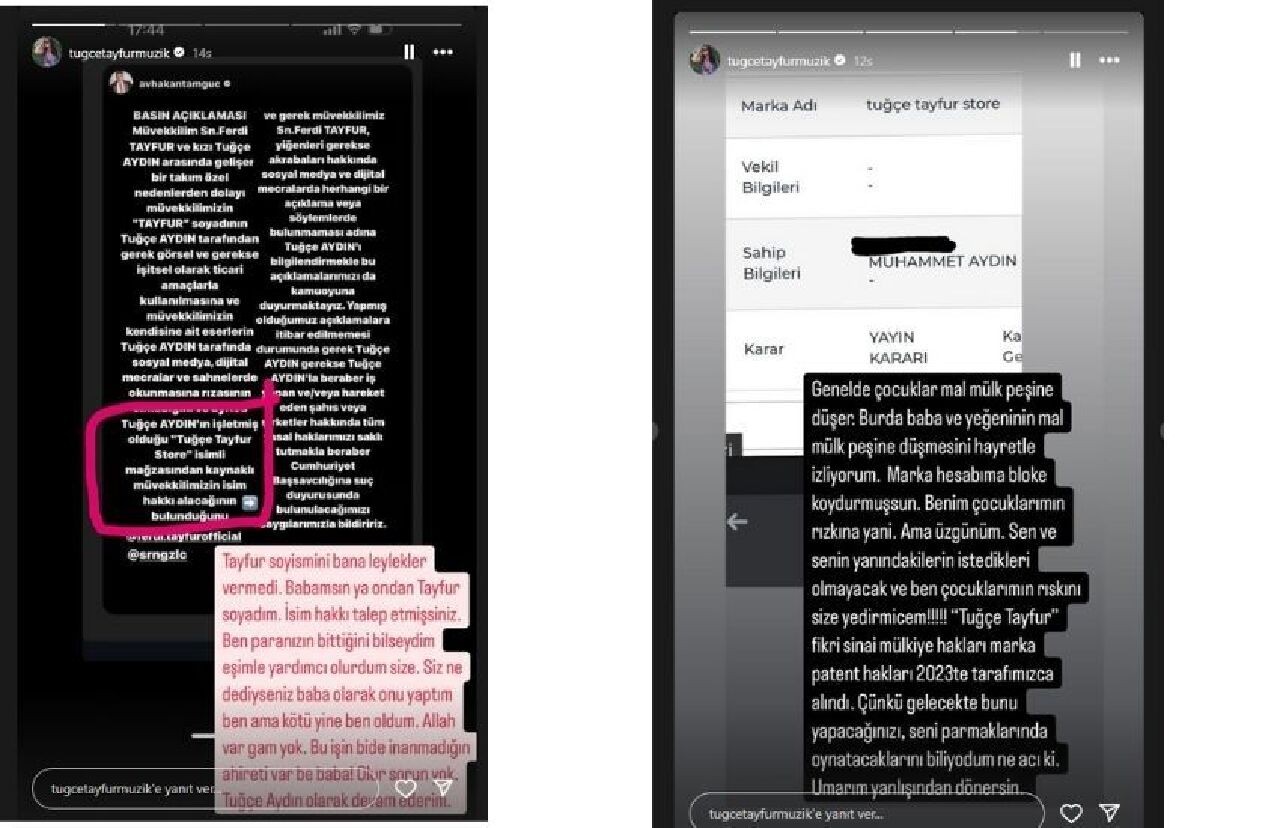 Tuğçe Tayfur kendisine yapılan yorumlar sonrası babası Ferdi Tayfur'un açıklamasına karşılık vererek, "Tayfur soy ismini bana leylekler vermedi. Babamsın ya ondan Tayfur soyadım. İsim hakkı talep etmişsiniz. Ben paranızın bittiğini bilseydim eşimle yardımcı olurdum size." açıklamasını yaptı.