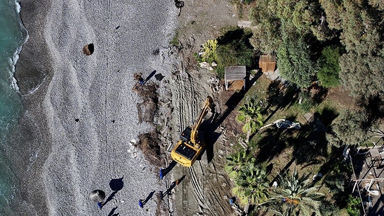 Fethiye’nin Çiftlik Mahallesi Koca Çalış sahilinde kıyı kenar çizgisi içinde yer alan kaçak yapıların yıkım süreci, Fethiye Belediyesi ekipleri tarafından yürütülüyor.