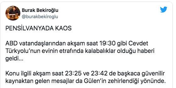 Öte yandan Avukat Burak Bekiroğlu sosyal medya hesabından yaptığı paylaşımda," PENSİLVANYADA KAOS! ABD vatandaşlarından akşam saat 19:30 gibi Cevdet Türkyolu’nun evinin etrafında kalabalıklar olduğu haberi geldi. Konu ilgili akşam saat 23:25 ve 23:42 de başkaca güvenilir kaynaktan gelen mesajlar da Gülen’in zehirlendiği yönünde." ifadelerini kullandı.