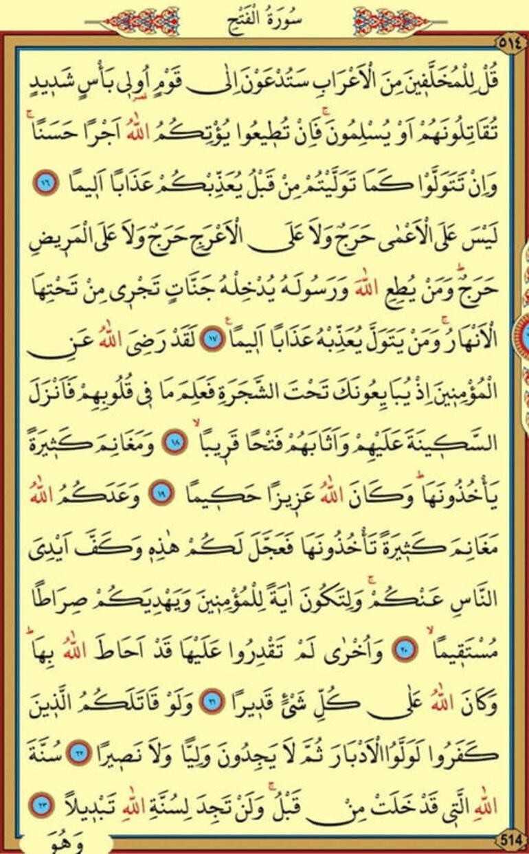 16.Kul lil muhallefıne minel a'rabi se tüd'avne ila kavmin ülı be'sin şedıdin tükatilunehüm ev yüslimun fe in tütıy'u yü'tikümüllahü ecran hasena ve in tetevellev kema tevelleytüm min kablü yüazzibküm azaben elıma
