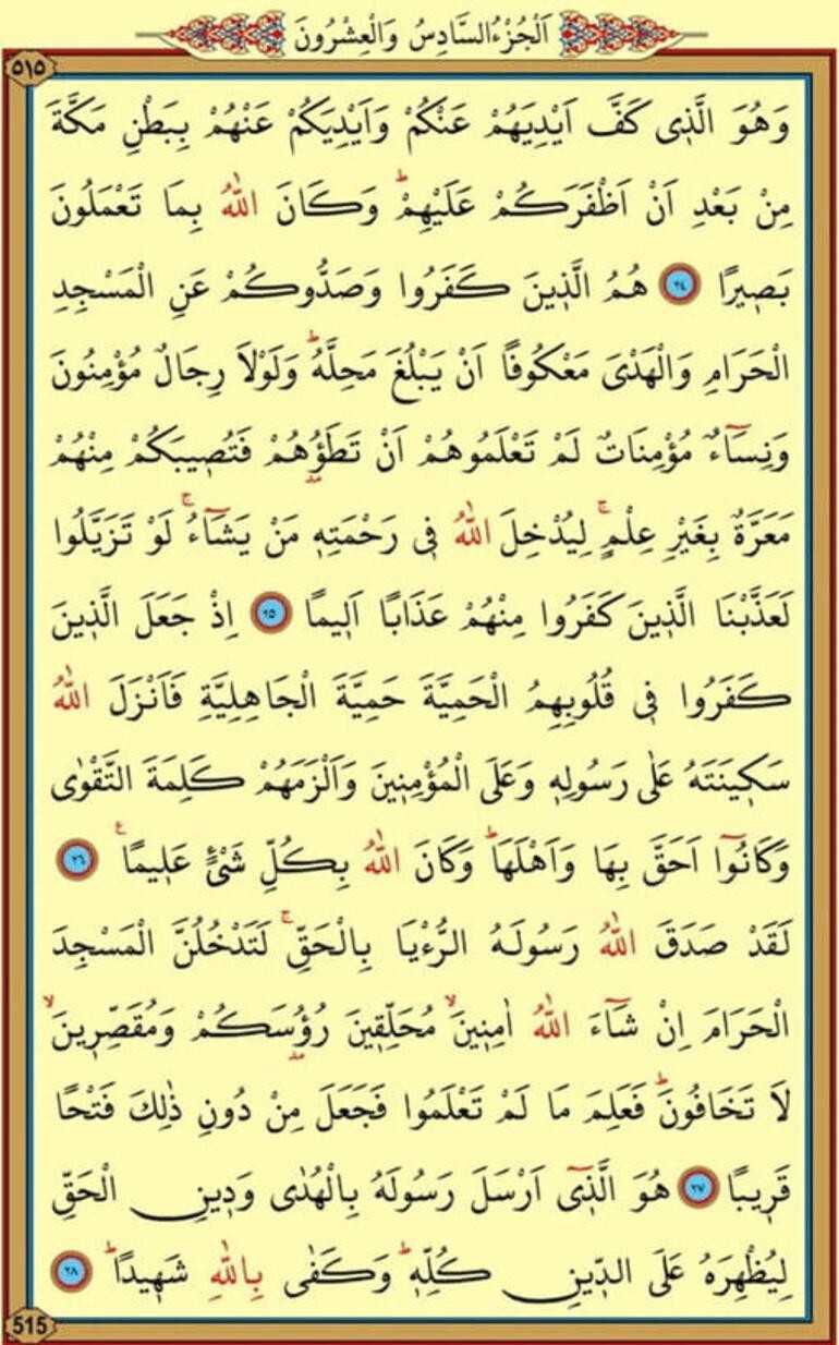 25.Hümüllezıne keferu ve sadduküm anil mescidil harami vel hedye ma'kufen ey yeblüğa mehılleh ve lev la ricalüm mü'minune ve nisaüm mü'minatül lem ta'lemuhüm en tetauhüm fe tüsıybeküm minhüm mearratüm bi ğayri ılm li yüdhılellahü fı rahmetihı mey yeşa' lev tezeyyelu le azzebnellezıne keferu minhüm azaben elıma