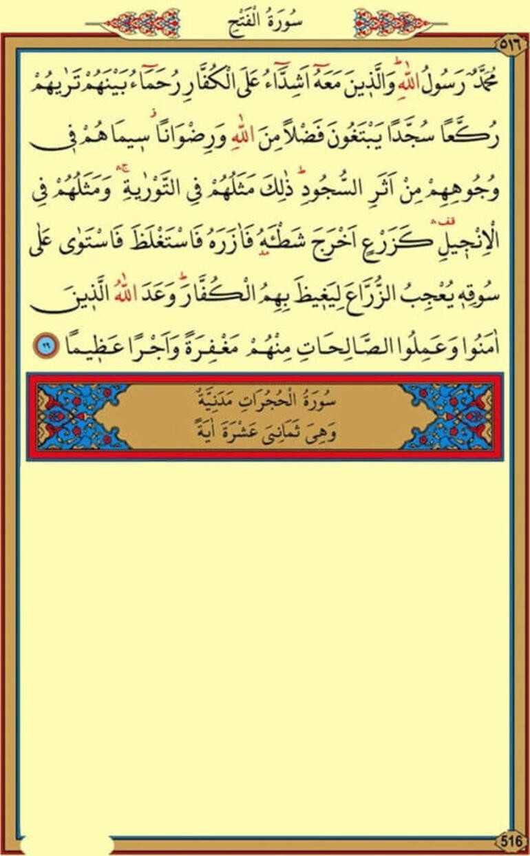 29.Muhammedür rasulüllah vellezıne meahu eşiddaü alel küffari ruhamaü beynehüm terahüm rukkean süccedey yebteğune fadlem minellahi ve rıdvana sımahüm fı vücuhihim min eseris sücud zalike meselühüm fit tevrati ve meselühüm fil incıl ke zer'ın ahrace şat'ehu fe azerahu festağleza festeva ala sukıhı yu'cibüz zürraa li yeğıyza bihimül küffar veadellahüllezıne amenu ve amilus salihati minhüm mağfiratev ve ecran azıyma