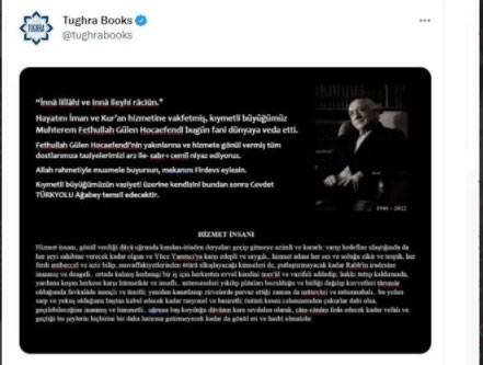 Fetullah Gülen son dakika öldü iddiası doğru mu? Terör örgütü FETÖ elebaşı Fetullah Gülen'in öldüğü iddia edildi. New Jersey’de bulunan Tughrbooks isimli kitap yayıncısı, FETÖ elebaşı Fetullah Gülen’in öldüğünü paylaştı. FETÖ elebaşı Fetullah Gülen, son yayınlanan videosunda hasta olduğunu, çok küçük bir eforu taşıyamayacak kadar hasta olduğunu belirtmişti.