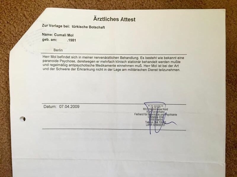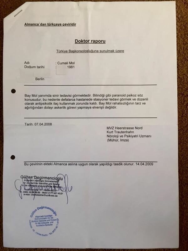 7 Nisan 2008 tarihinde Türkiye Başkonsolosluğuna sunulmak üzere verilen doktor raporunda, “Bay Mol yanımda sinir tedavisi görmektedir. Bilindiği gibi paranoid psikoz söz konusudur, bu nedenle defalarca hastanede stasyoner tedavi görmek ve düzenli olarak antipsikotik ilaç kullanmak zorunda kaldı. Bay Mol, rahatsızlığının tarz ve ağırlığından dolayı askerlik görevi yapmaya elverişli değildir” ifadeleri yer aldı.
