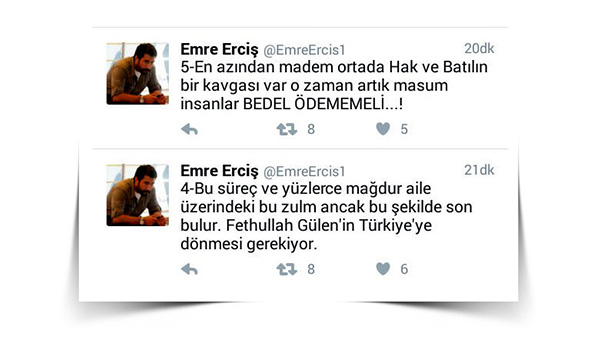 Paralel yapıya finans sağladığı için bu sabah Kaynak Holding ve 19 şirketine kayyum atanmasının ardından twitter hesabında açıklamalar yapan Emre Erciş, Fetullah Gülen için "yapması gereken tek şey, ilk uçak ile Türkiye'ye gelip teslim olmak" dedi.