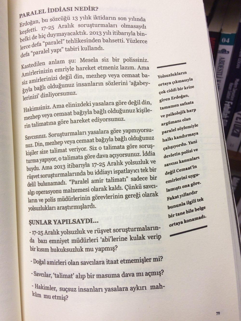 Fetullahçı ihanet şebekesinin “Hizmet Hareketi” ve “Cemaat” olarak nitelendirildiği kitapta, 17-25 Aralık kirli operasyonlarını gerçekleştiren FETÖ militanları için de aklama çabası bulunuyor. D&R’da satılan FETÖ kitabında “Suçüstü Yapılanların Tek Sığınağı – Paralel Söylemi” başlıklı bölümünde polis kılıklı teröristler için şu ifadeler kullanılıyor: “Eğer 17-25 Aralık operasyonunu yapan polisler hırsız, arsız, helale harama dikkat etmeyen devlet memurları olsaydı bugün milyonlar içinde yüzerlerdi. Ama onlar operasyonları yaparken ceplerinde 15 TL, 20 TL bulunuyordu.”