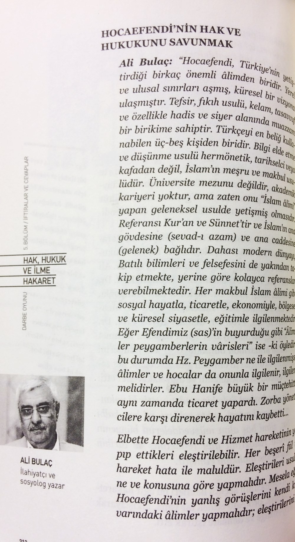 Gülen’in hayatı ve sözde eğitim mücadelesi anlatılan bölümün ardından FETÖ’cü tutuklu yazar Ali Bulaç’ın “Hocaefendinin Hak ve Hukukunu Savunmak” başlıklı yazısı yer alıyor. Yazıda Gülen için, “Üniversite mezunu değildir, akademik kariyeri yoktur ama onu ‘İslam alimi’ yapan geleneksel usulde yetişmiş olmasıdır” deniliyor.
