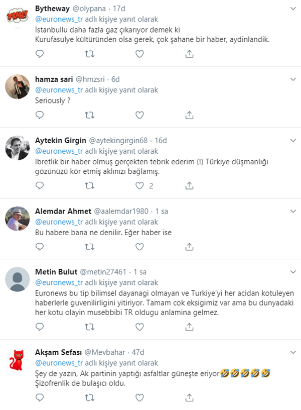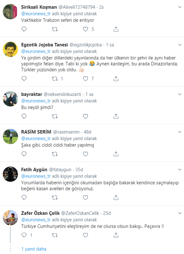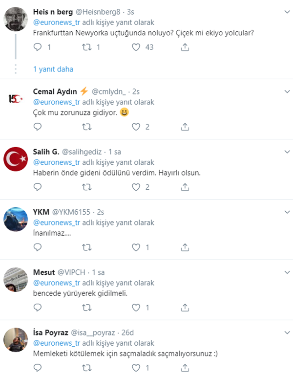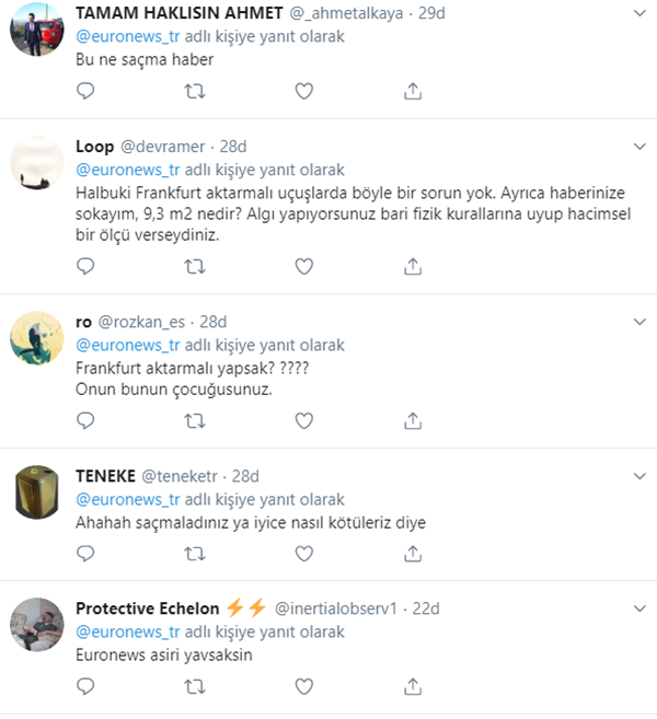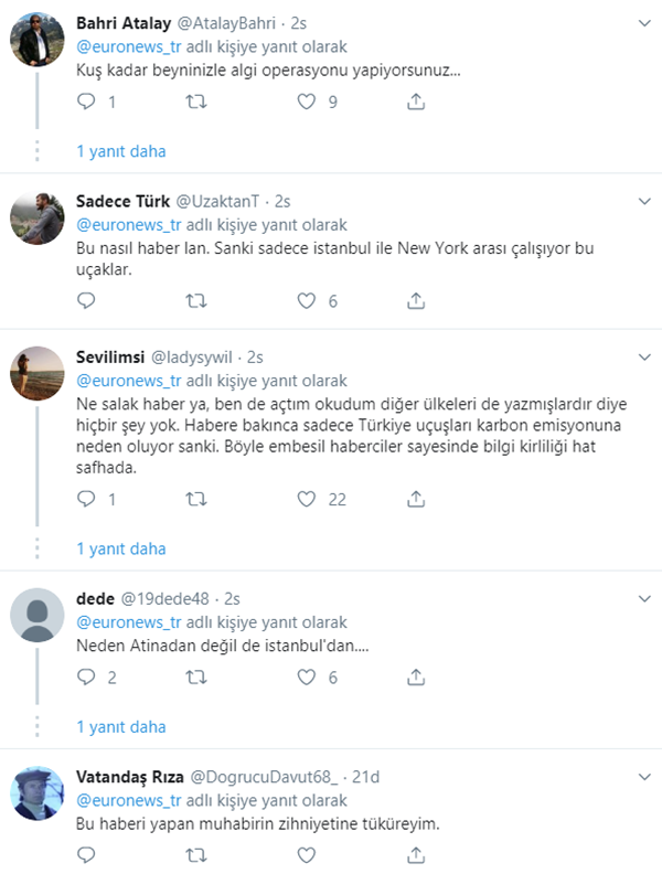 Sosyal medya kullanıcıları, söz konusu haberin altına yaptıkları yorumlarda tepkilerini dile getirdi. Bir kullanıcı, “Kuş kadar beyninizle algı operasyonu yapıyorsunuz...” derken, bir başka isim, “Ne salak haber ya, ben de açtım okudum, diğer ülkeleri de yazmışlardır diye hiçbir şey yok. Habere bakınca sadece Türkiye uçuşları karbon emisyonuna neden oluyor sanki. Böyle embesil haberciler sayesinde bilgi kirliliği had safhada.” ifadelerini kullandı.