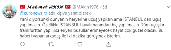 yeniakit.com.tr FETÖ’cü Servet Yanatma, EuroNews’te yayınlanan haberinde açık Türkiye düşmanlığı yaptı. Son zamanlarda havacılık sektöründeki ataklarıyla ön plana çıkan Türkiye’ye bir teröristin karşı çıkması şaşırtmazken, saldırı sebebi beyin yaktı. Yanatma, İstanbul-New York uçuşunda her yolcunun Kutuplarda 9,3 metre kare buzul erimesine yol açtığını söyledi. Yanatma’nın diğer ülkelerin uçuşları sırasında ortaya çıkan karbon emisyonundan bahsetmeden yalnızca İstanbul’u hedef alan haberine, sosyal medya kullanıcıları çok sert tepki gösterdi.