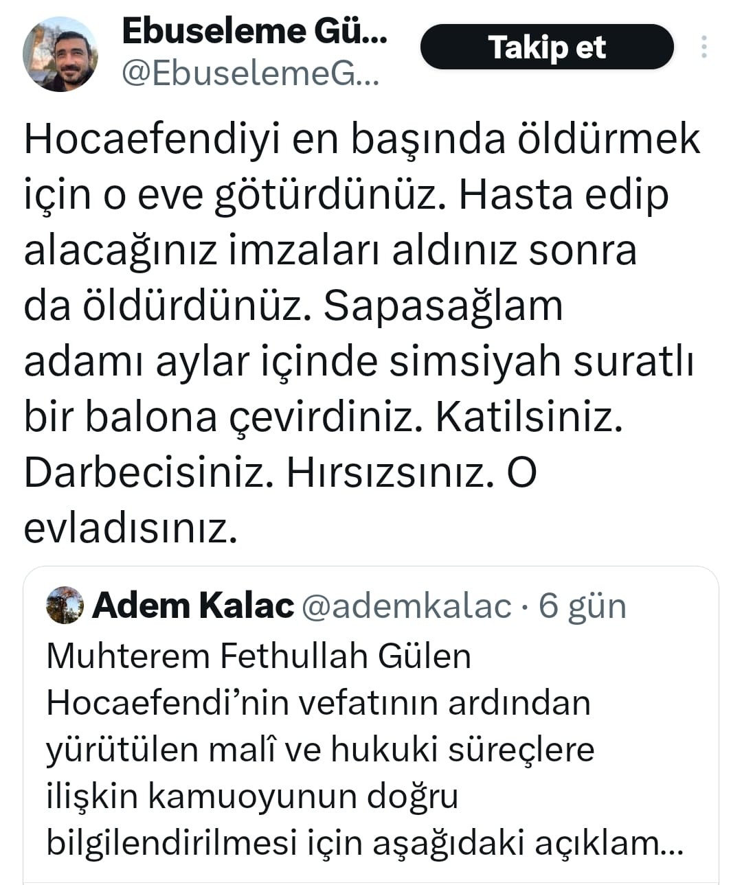 Gülen'in öz yeğeni Ebusseleme Gülen de, "En başında öldürmek için o eve götürdünüz. Hasta edip alacağınız imzaları aldınız sonra da öldürdünüz. Sapasağlam adamı aylar içinde simsiyah suratlı bir balona çevirdiniz. Katilsiniz. Darbecisiniz. Hırsızsınız. O evladısınız" dedi.