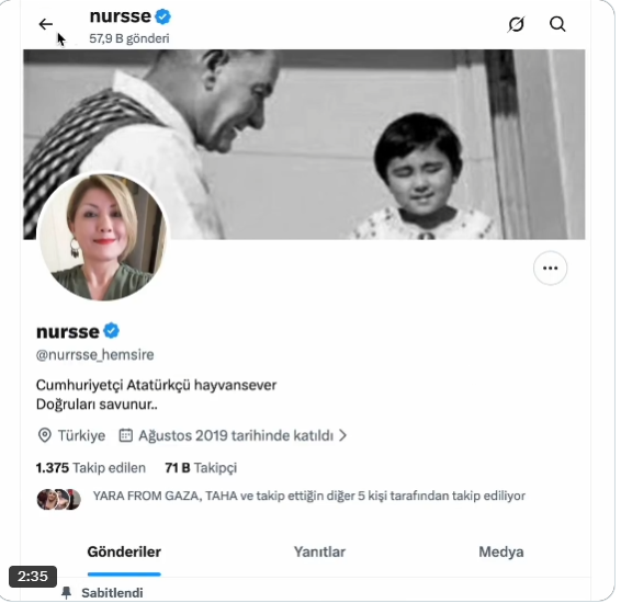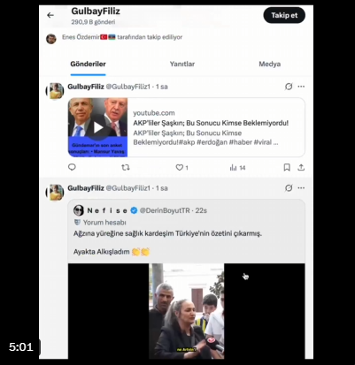 kaçak FETÖ'cülerin videolarını "bu adamı tanıyan var mı?" ya da "FETÖ'cü diyorlar ama doğru söylemiyor mu?" şeklindeki sorularla birlikte paylaşıp örgütü ve mensuplarını normalleştirme görevini üstlenmiş. Özellikle paylaştığı Cevheri Güven videoları, daha küçük hesaplar tarafından hızla yayılıyor. İki numaralı videoda İmamoğlu profil fotolu yüzlerce belki de binlerce FETÖ hesabının nasıl algı çalışması yürüttüğünü ve yine aynı videoda spor klüpleri adına açılmış futbol konseptli tuzak hesapları görebilirsiniz. Bu gördüğünüz buzdağının sadece suyun üstündeki bölümü. X platformu gündemini net şekilde etkileyecek güçleri var. Her yerdeler :))