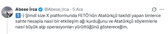 Bu haber, FETÖ'nün (Fethullahçı Terör Örgütü) X platformunda (eski adıyla Twitter) binlerce sahte "Atatürkçü" profili kullanarak nasıl bir algı operasyonu ve etkileşim ağı kurduğunu, bu ağın amacının iktidarı değiştirmek olduğunu ve bu operasyonlarda @KendineMuhabir, @BRCNYLDRM_, @sokakkedisitv gibi tanınmış Atatürkçü görünümlü kişileri nasıl kullandığını detaylı kanıtlarla açıklayan çarpıcı bir iddiadır. Kaynak: Abese İrca x hesabından alınmıştır.
