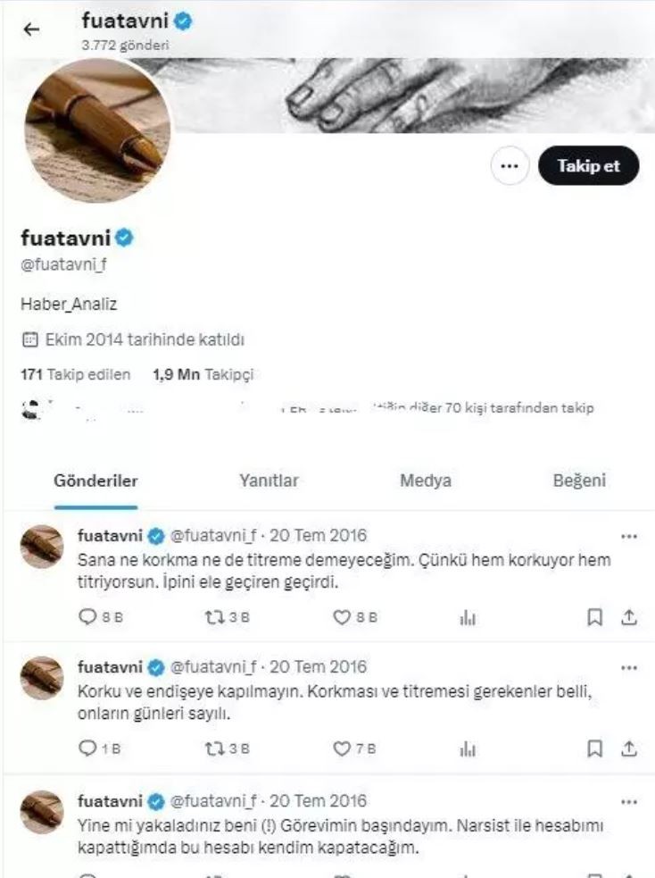 İstihbarat Dairesi Başkanlığında çalışan FETÖ mensubu bilgisayar mühendislerinden sorumlu olan "Fuat Avni" hesabı yeniden ortaya çıktı. Fuat Avni hesabının mavi tik aldığı görüldü.