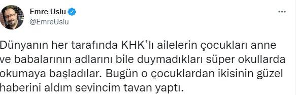 FETÖ firarisi Emre Uslu sosyal medya hesabı üzerinden yaptığı paylaşımda, "Dünyanın her tarafında KHK’lı ailelerin çocukları anne ve babalarının adlarını bile duymadıkları süper okullarda okumaya başladılar. Bugün o çocuklardan ikisinin güzel haberini aldım sevincim tavan yaptı" ifadelerini kullandı.