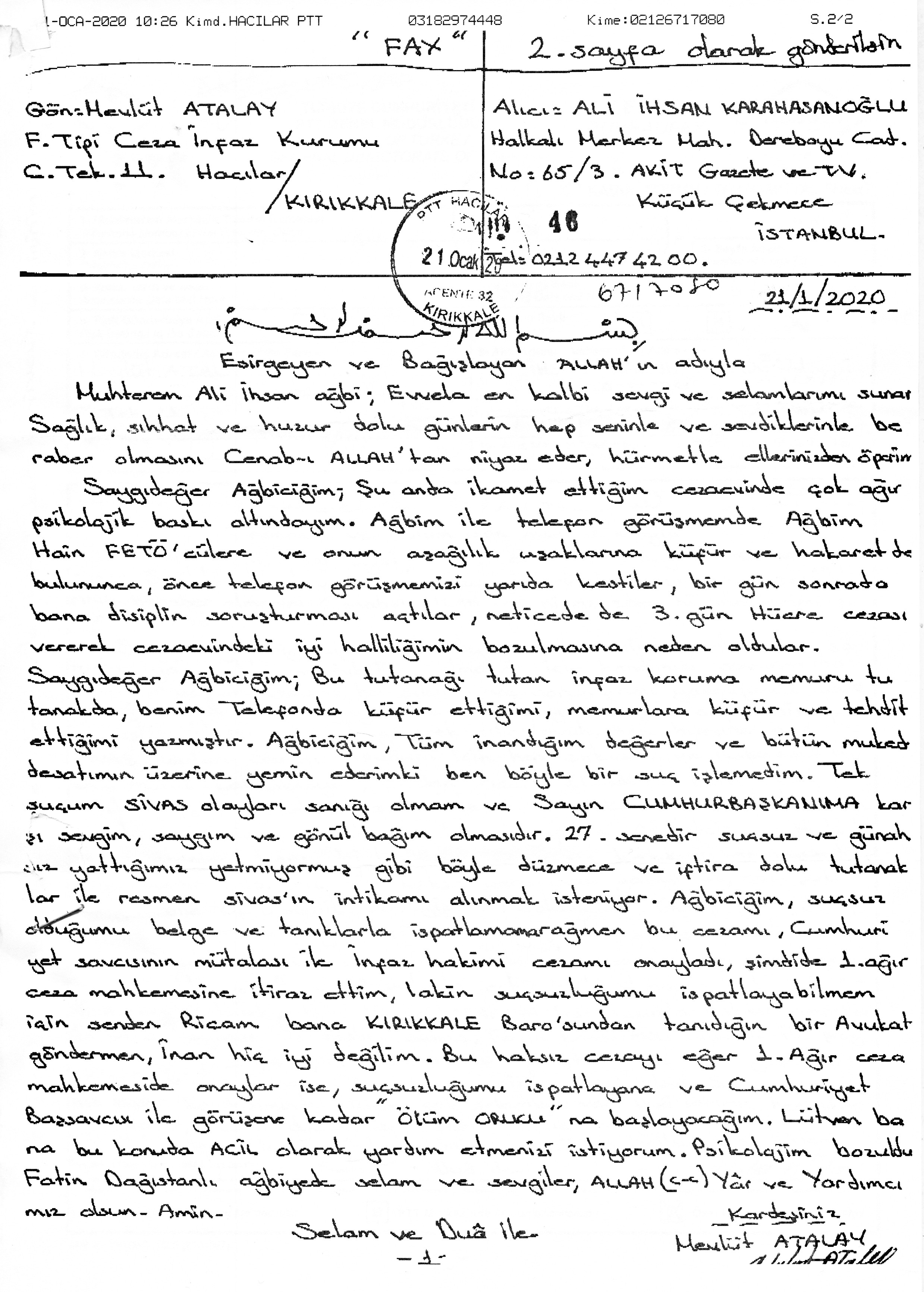 Atalay şöyle devam etti: “Bu tutanağı tutan infaz koruma memuru tutanakta, benim telefonda küfür ettiğimi, memurlara küfür ve tehdit ettiğimi yazmıştır. Tüm inandığım değerler ve bütün mukaddesatımın üzerine yemin ederim ki ben böyle bir suç işlemedim. Tek suçum SİVAS olayları sanığı olmam ve Sayın CUMHURBAŞKANIMA karşı sevgim, saygım ve gönül bağım olmasıdır. 27 senedir suçsuz günahsız yattığımız yetmiyormuş gibi böyle düzmece ve iftira dolu tutanaklar ile resmen Sivas’ın intikamı alınmak isteniyor” dedi.