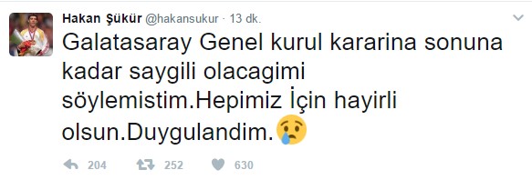 Karara sevinen Şükür, paylaşımına; "Galatasaray Genel Kurul kararına sonuna kadar saygılı olacağımı söylemiştim. Hepimiz için hayırlı olsun. Duygulandım." ifadelerini yazdı.