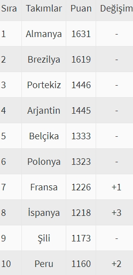 Dünya Kupası'nın son şampiyonu Almanya, sıralamada zirvedeki yerini korudu. Almanya'nın ardından sıralanan Brezilya, Portekiz, Arjantin ve Belçika'nın da yerleri değişmedi.