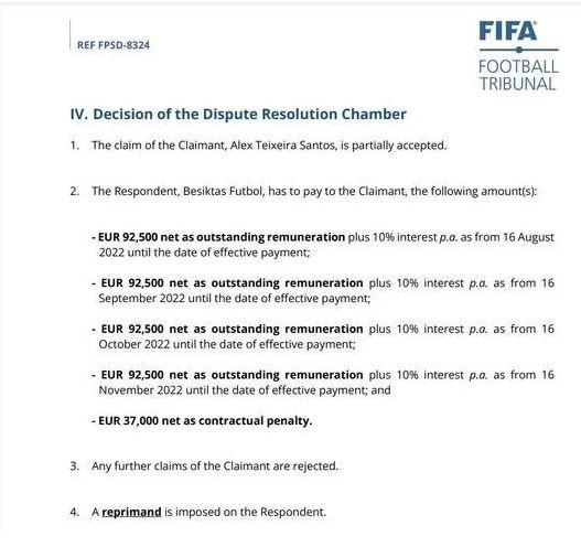 Alex Teixeira ise bu ücretin yüzde 10 cezai şartla birlikte toplam 407 bin euro olarak ödenmesi için FIFA'ya başvurdu. FIFA Uyuşmazlık ve Çözüm Kurulu da Alex Teixeira'yı haklı bularak 407 bin euro'nun ödenmesini Beşiktaş'a tebliğ etti.