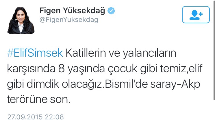 Yüksekdağ PKK'nın katlettiği Elif'i güvenlik güçleri katletmiş gibi göstererek, "Katillerin ve yalancıların karşısında 8 yaşında çocuk gibi temiz,elif gibi dimdik olacağız.Bismil'de saray-Akp terörüne son." yazdı.