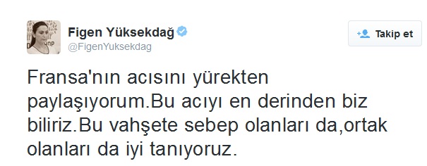 Fransa'daki terör saldırısının ardından sosyal medyadan bir mesaj yayınlayan HDP Eş Başkanı Figen Yüksekdağ, "Bu acıyı en derinden biz biliriz.Bu vahşete sebep olanları da,ortak olanları da iyi tanıyoruz" yorumunda bulundu. Yüksekdağ'ın açıklamasına tepki gösterenler tepkilerini, "Bir terör örgütü destekçisi olarak bunu sen mi söylüyorsun" sözleriyle dile getirdiler.