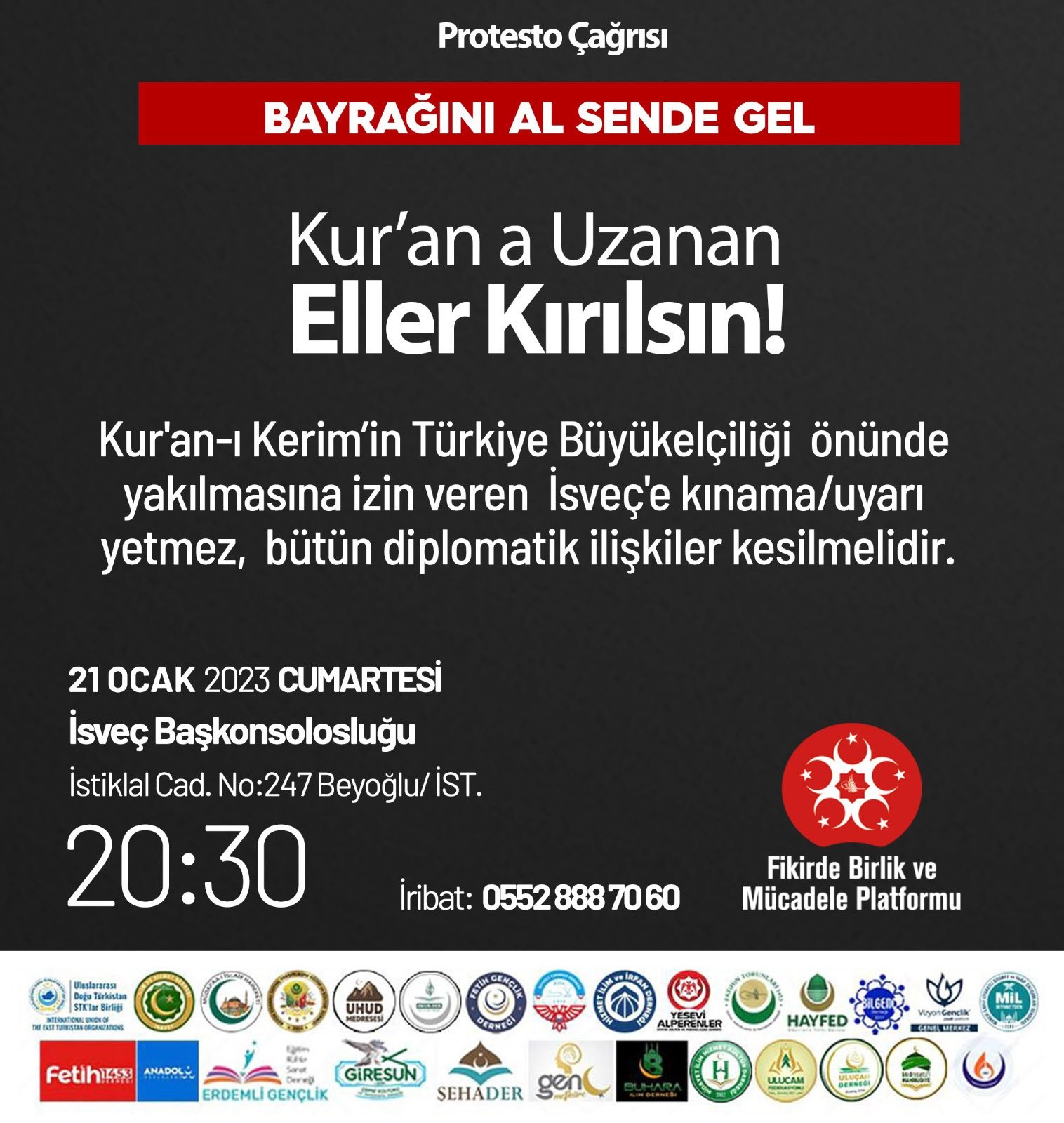 Danimarkalı aşırı sağcı Sıkı Yön Partisi Lideri Rasmus Paludan'ın polis koruması eşliğinde Türkiye'nin Stockholm Büyükelçiliği önünde Kur'an-ı Kerim yakması büyük tepkiyle karşılandı. Fikirde Birlik ve Mücadele Platformu, "bayrağını al sende gel", "Kuran'a uzanan eller kırılsın" diyerek vatandaşları saat 20:30'da İsveç Başkonsolosluğu önünde protestoya çağırdı.