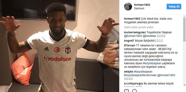Başkan Orman, Hollandalı futbolcunun Beşiktaş formalı fotoğrafını paylaştığı mesajında, "Çok istedi bizi, biz de onu. Hoş geldin ailemize Jeremain." ifadelerini kullandı.