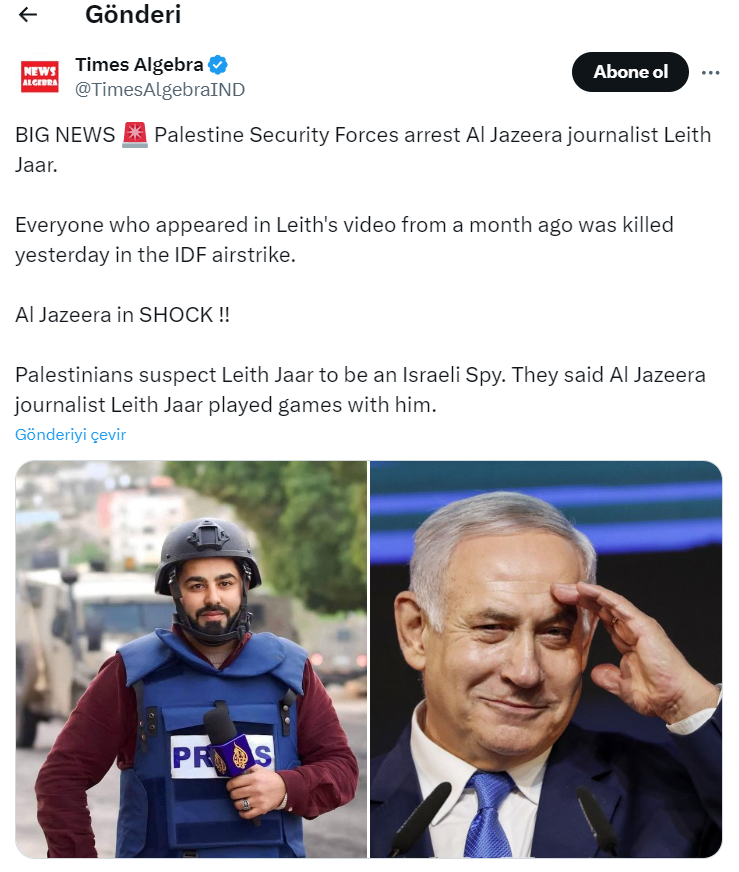 İddia, Hindistan merkezli ve siyonist israil yanlısı “Times Algebra” isimli medya organından geldi. Times Algebra’nın sosyal medya hesabından yayınladığı habere göre, Katar merkezli El Cezire bünyesinde muhabirlik yapan Lait Jaar, İsrail casusu olduğu gerekçesiyle tutuklandı.