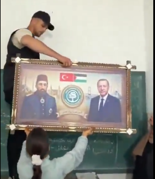 Videoda, Osmanoğlu Yardımlaşma Derneği’nin destekleriyle yenilenen veya yardım ulaştırılan Gazze Hamidiye Okulu olduğu anlaşılan sınıflarda, Erdoğan’ın ve II. Abdülhamid’in bir arada olduğu tabloların duvara asıldığı anlar yer alıyor. Görüntülerde dikkat çeken diğer detaylar ise şöyle: