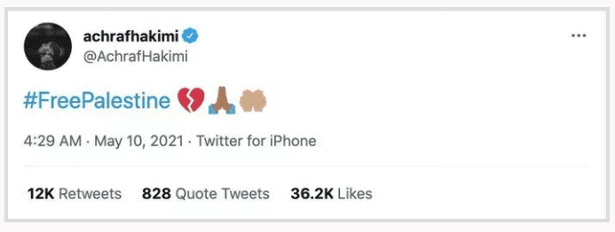 Achraf Hakimi, İsrail'in düzenlediği saldırılarda sosyal medya hesabından #FreePalestine etiketiyle paylaşım yaparak Filistin'e destek vermişti.