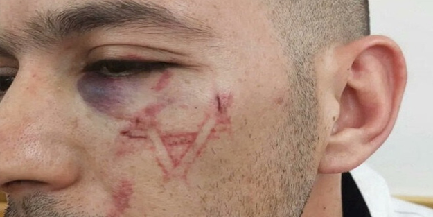 Sosyal medyada yayılan fotoğraflarda, Filistinli gencin yüzünde, Yahudiliğin sembolü olarak bilinen altı köşeli Davut Yıldızı sembolünün izleri açık şekilde görülüyor.