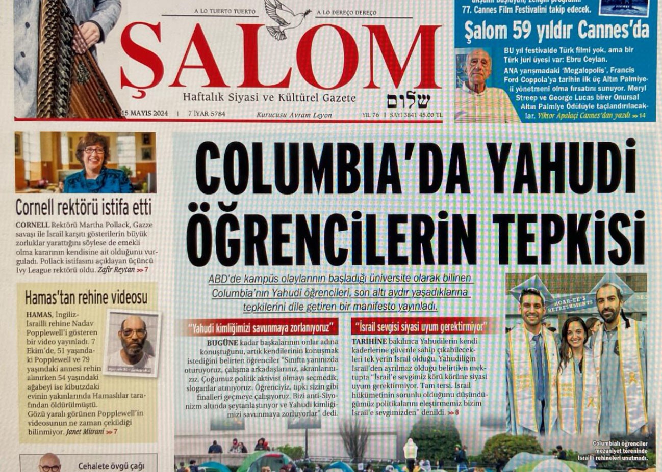 Gazze'de öldürülen masum çocuk ve kadınlara tek bir laf edemeyen Şalom ABD'deki Yahudi öğrenciler için manşet attı.